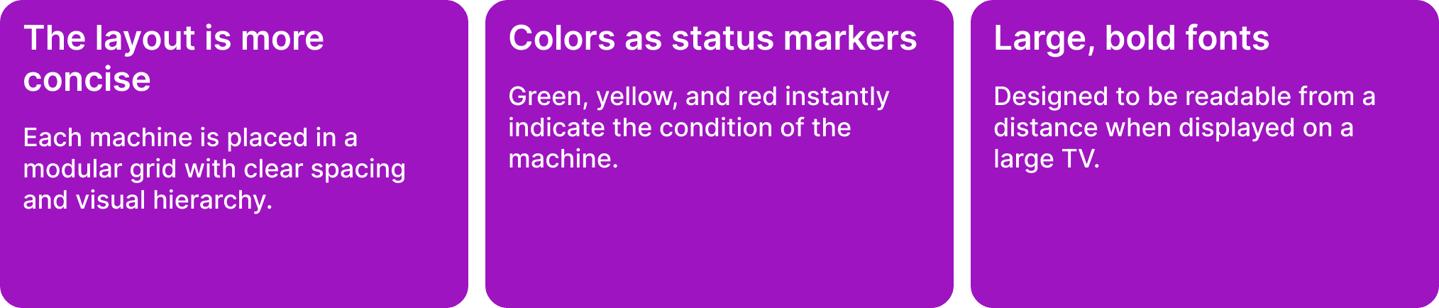 The goal of the redesign was to create a dashboard that prioritized clarity, focus, and visibility operators and managers could immediately identify performance issues and take action without needing to step closer or squint.