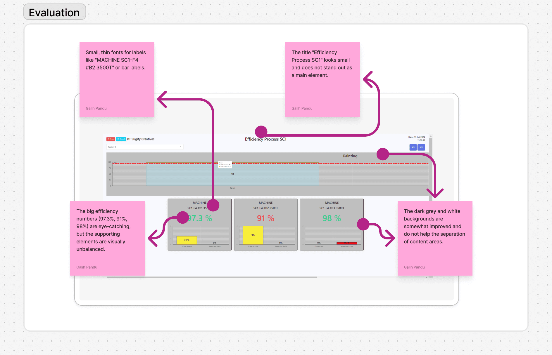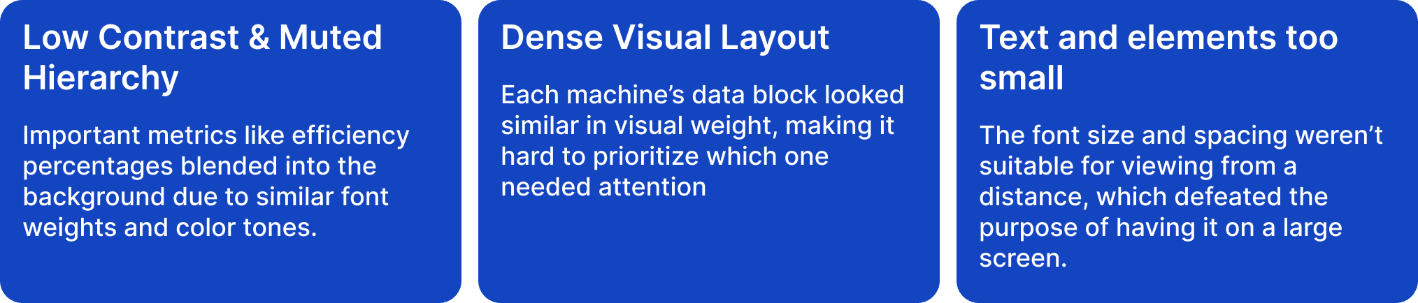 The client’s dashboard was displayed on a large TV screen in the production floor to help both operators and managers monitor real-time metrics. However, the design was cluttered, making it difficult to quickly locate key information.