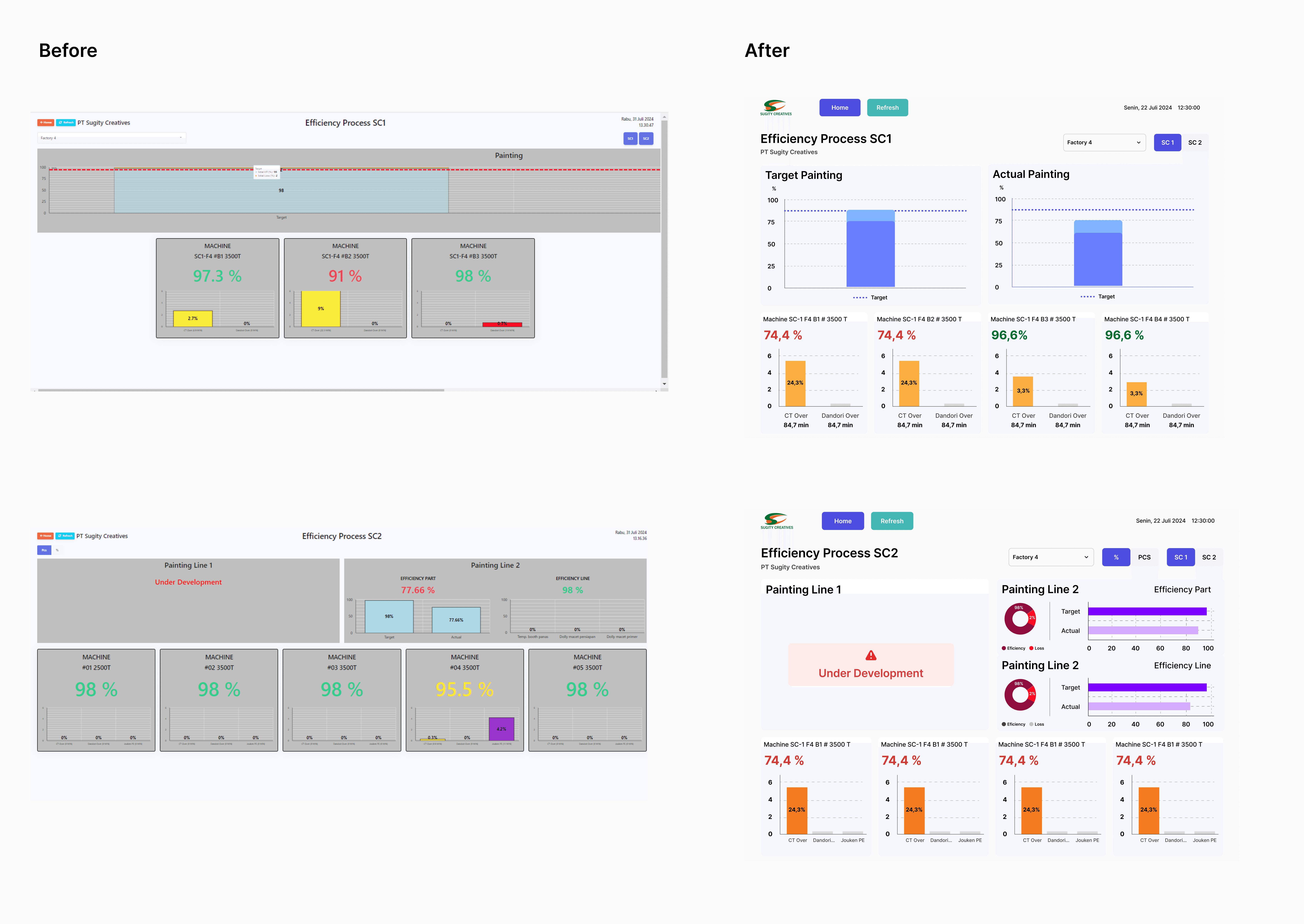The end result of this dashboard redesign puts readability and clarity of information as the top priority. With a cleaner layout, a more intuitive color system, and visual elements that highlight important data, the dashboard is now effectively used by operators and managers in daily production activities.