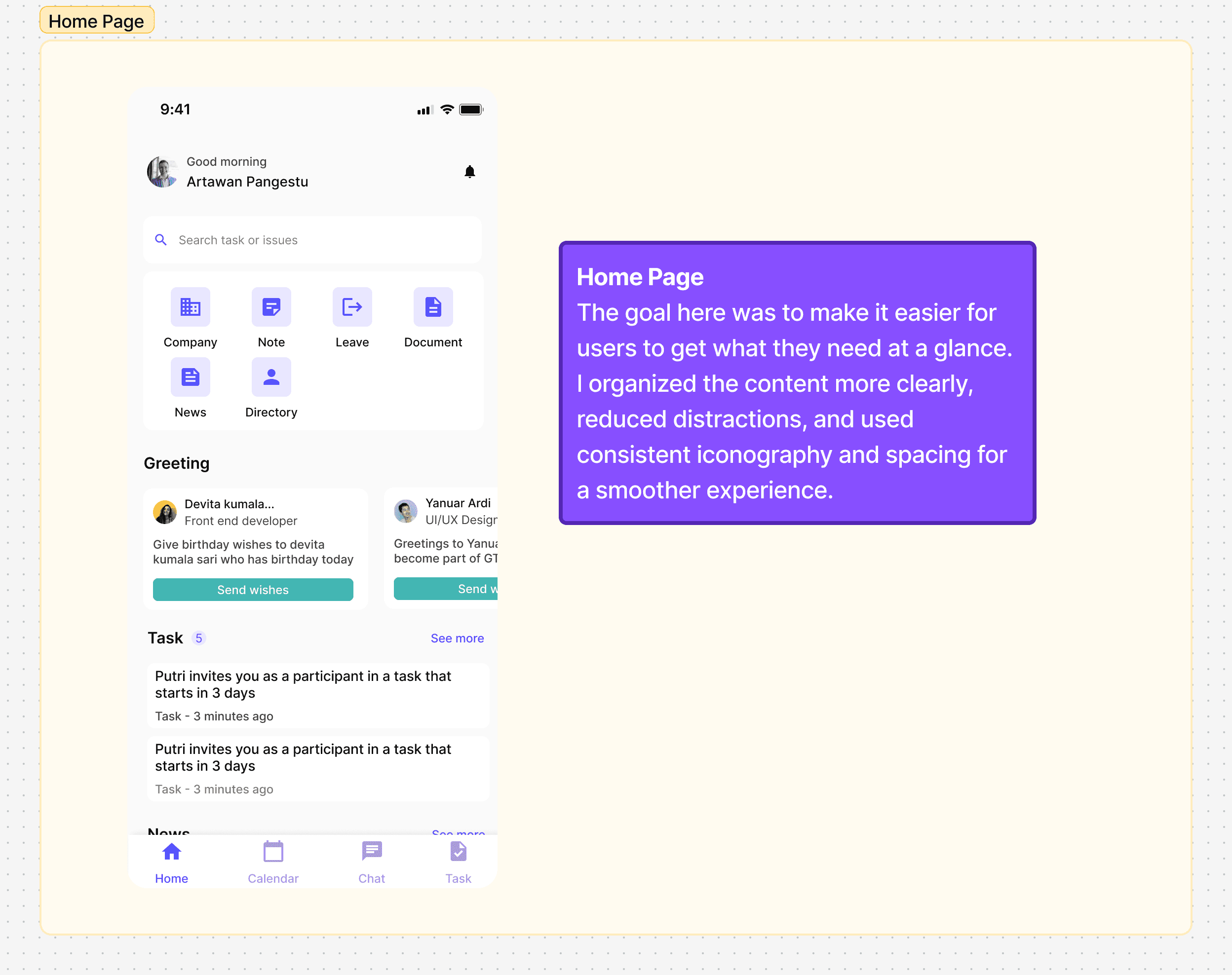 To improve the clarity, usability, and visual appeal of the app's core screens—enhancing HR productivity and providing a smoother user experience for daily task management and collaboration.